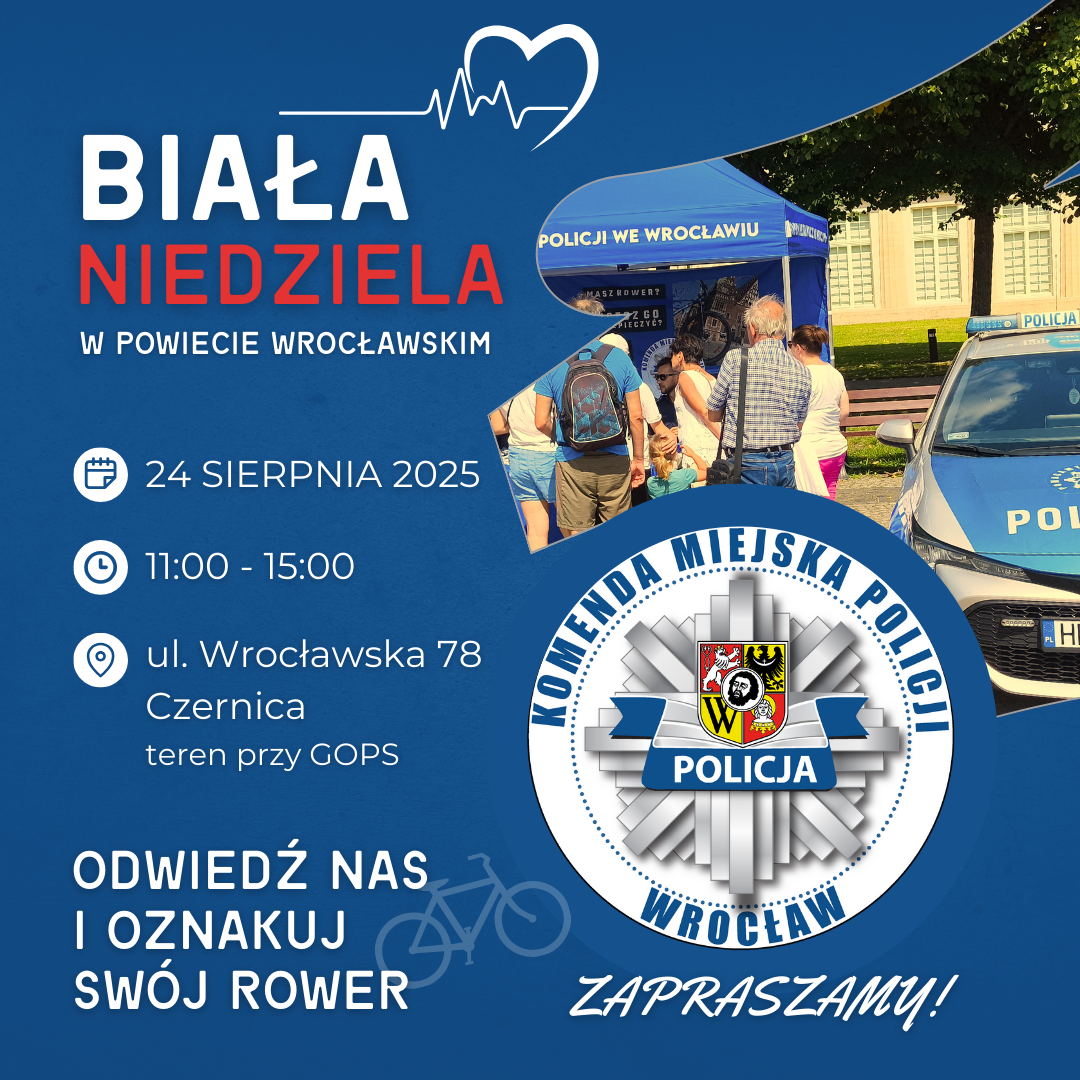 Już w tą niedzielę zaproszeni zostaliśmy do udziału w wyjątkowym wydarzeniu pn. „Biała Niedziela”, które odbędzie się 24 sierpnia w godzinach 11:00–17:00 przy ul. Wrocławskiej 78 w Czernicy. To doskonała okazja, aby bezpłatnie skorzystać z konsultacji specjalistów, wykonać profilaktyczne badania, a przy tym spędzić czas w miłej i rodzinnej atmosferze. Zapraszamy również na nasze prewencyjne stoisko, na którym będzie można również oznakować swój rower.