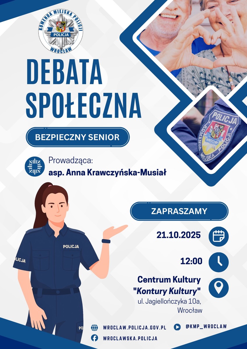 Policjanci z Komisariatu Policji Wrocław-Ołbin zapraszają 21 października br. do Centrum Kultury "Kontury Kultury" przy ul. Jagiellończyka 10a o godz. 12:00, gdzie odbędzie się debata społeczna pn. „ Bezpieczny Senior”. Jej celem jest przybliżenie wszystkim zainteresowanym zagrożeń związanych z m.in. oszustwami na tzw. legendę, w sieci internetowej oraz na blika. Wszystkie informacje znajdują się na zamieszczonym poniżej plakacie.