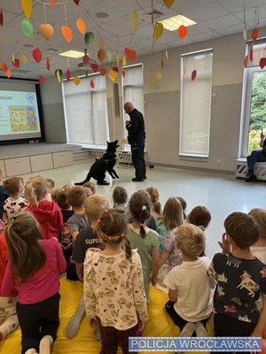 W ostatnim czasie w przedszkolu „Niezapominajka” przy ul. Dożynkowej odbyły się wyjątkowe zajęcia edukacyjne. Funkcjonariusz z Komisariatu Wrocław Krzyki oraz przewodnicy psów służbowych z Komendy Miejskiej Policji we Wrocławiu spotkali się z przedszkolakami oraz kadrą pedagogiczną aby porozmawiać na temat bezpiecznej drogi do szkoły i zasad właściwego zachowania na drodze.