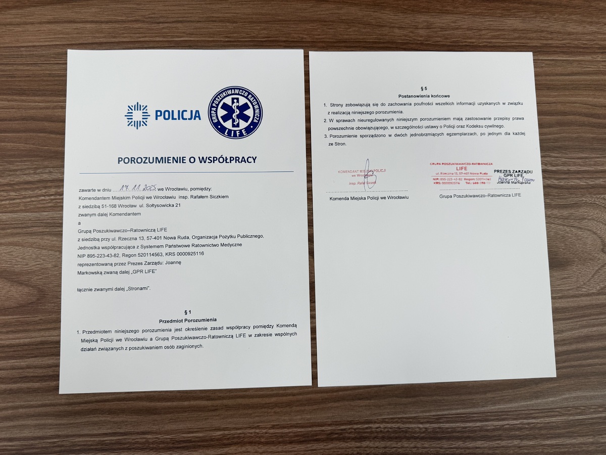 Wczoraj, tj. 17 listopada br., zawarte zostało porozumienie o współpracy pomiędzy Komendą Miejską Policji we Wrocławiu a Grupą Poszukiwawczo-Ratowniczą LIFE z siedzibą w Nowej Rudzie. Dokument podpisali Komendant Miejski Policji we Wrocławiu, insp. Rafał Siczek oraz Prezes Zarządu Grupy Poszukiwawczo-Ratowniczej LIFE, Joanna Markowska.