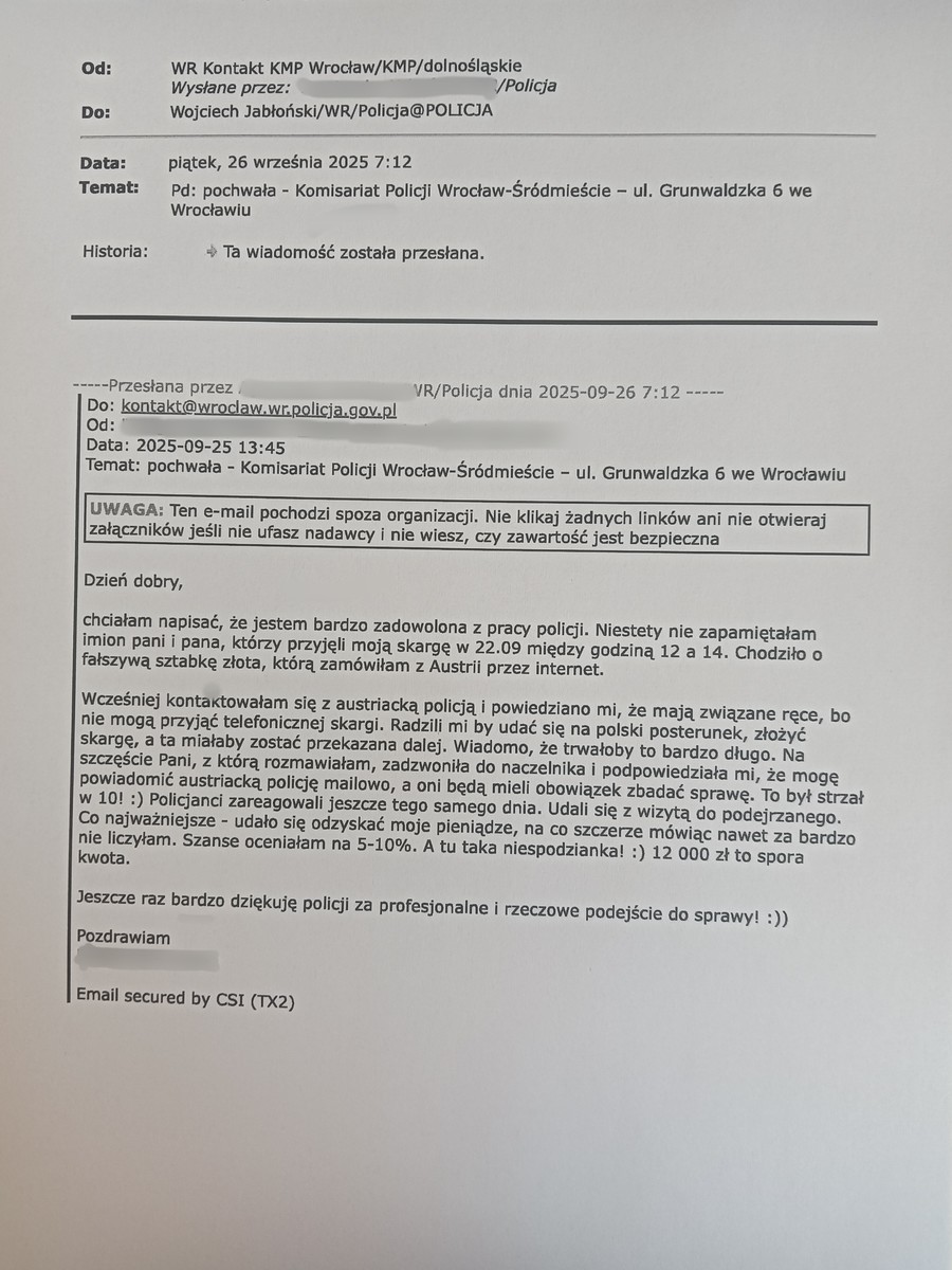 Mężczyzna w swojej korespondencji podkreślił profesjonalizm sierż. Tomasza Gałan z Zespołu Wykroczeń Komisariatu Policji-Wrocław Osiedle, który prowadził czynności wyjaśniające w sprawie stworzenia zagrożenia w ruchu drogowym. Funkcjonariusz błyskawicznie dotarł do sprawcy i doprowadził do jego ukarania.
