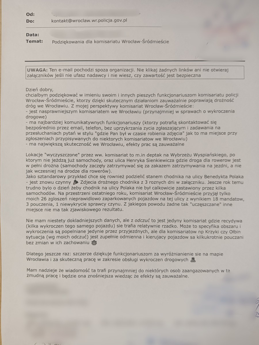 Do Komendy Miejskiej Policji we Wrocławiu wpłynęło podziękowanie od jednego z mieszkańców miasta, który wyraził swoje uznanie dla funkcjonariuszy z Komisariatu Policji Wrocław - Śródmieście. W przesłanych podziękowaniach podkreślił skuteczność działań policjantów, które jak zaznaczył - są wyraźnie zauważalne i przyczyniły się do poprawy drożności dróg na terenie Śródmieścia.