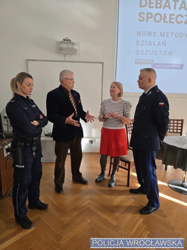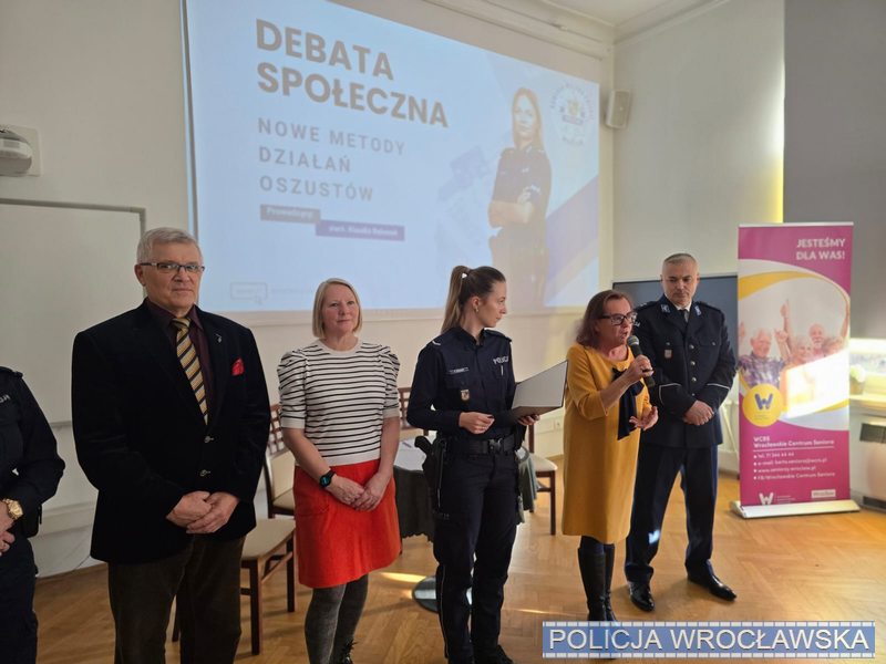 10 grudnia br. we Wrocławskim Centrum Rozwoju Społecznego odbyła się debata społeczna pn. “Nie daj się oszukać” zorganizowana przez Komendę Miejską Policji we Wrocławiu. Jej celem było zwiększenie świadomości mieszkańców, w szczególności seniorów, na temat metod działania współczesnych oszustw, zagrożeń w cyberprzestrzeni oraz zasad bezpieczeństwa bankowego. W spotkaniu udział wzięli eksperci z dziedziny prewencji i profilaktyki wrocławskiej komendy miejskiej, straży miejskiej oraz z dziedziny bankowości.