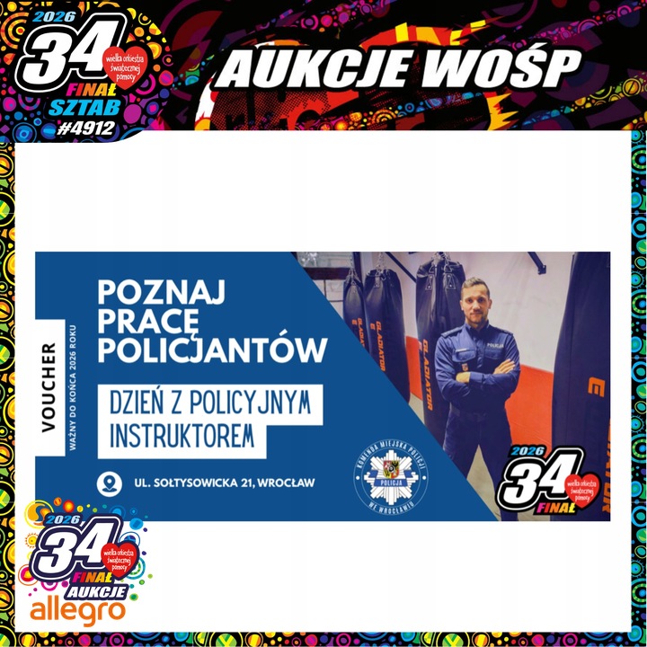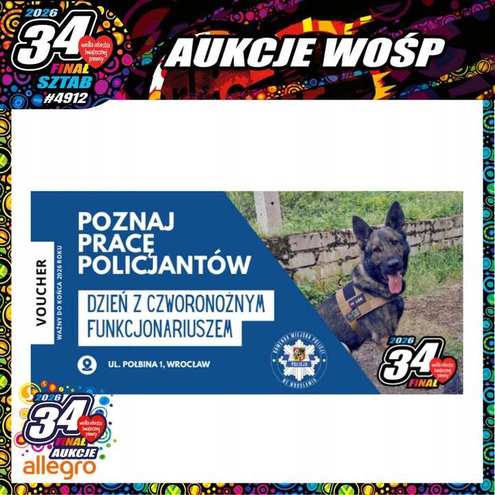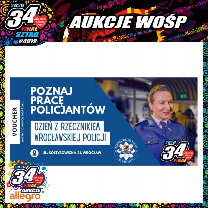 34. Finał WOŚP odbędzie się 25 stycznia 2026 roku. Mottem akcji jest "Zdrowe brzuszki naszych dzieci ", a ta stanie się doskonałą okazją do spotkania z mundurowymi na stoiskach promocyjnych w trakcie pikników odbywających się na terenie Wrocławia. Nie zabraknie rozmów o bezpieczeństwie, ale także prezentacji specjalistycznych pojazdów służbowych i policyjnego sprzętu. Dodatkowo funkcjonariusze włączyli się w licytacje na rzecz WOŚP, organizując własne aukcje. Serdecznie zapraszamy i zachęcamy do licytowania: