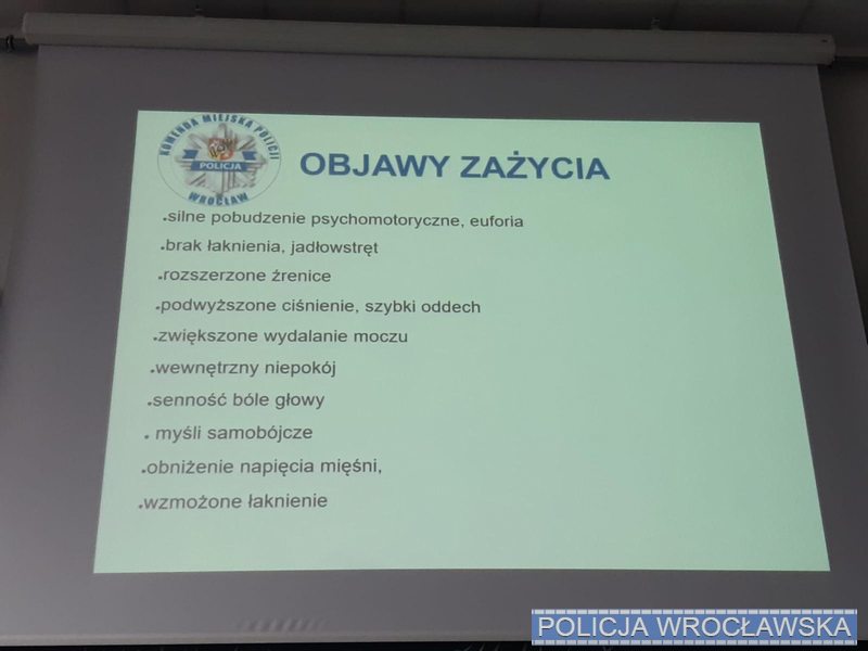 Policjantka z Wydziału Prewencji i Patrolowego Komendy Miejskiej Policji we Wrocławiu przeprowadziła zajęcia profilaktyczne skierowane do nauczycieli Liceum Ogólnokształcącego Edukacja. Tematem spotkania były środki odurzające oraz problemy związane z ich używaniem przez młodzież.