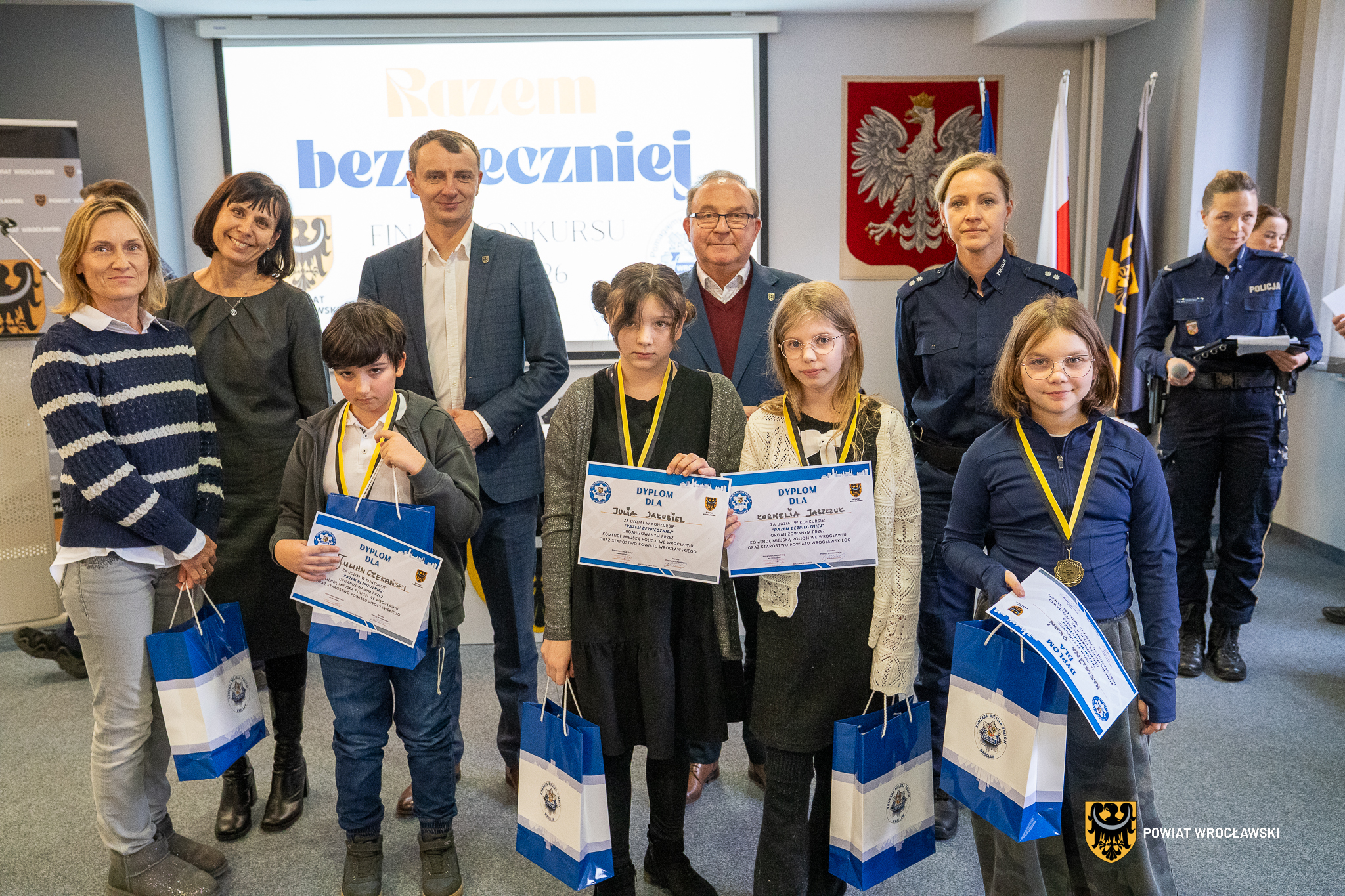 W siedzibie Starostwa Powiatowego odbył się uroczysty finał konkursu „Razem Bezpieczniej”, organizowanego wspólnie przez Komendę Miejską Policji we Wrocławiu oraz Powiat Wrocławski. Nagrody otrzymali wszyscy uczestnicy reprezentujący szkoły podstawowe z gmin: Kąty Wrocławskie, Sobótka, Kobierzyce, Żórawina oraz Czernica.