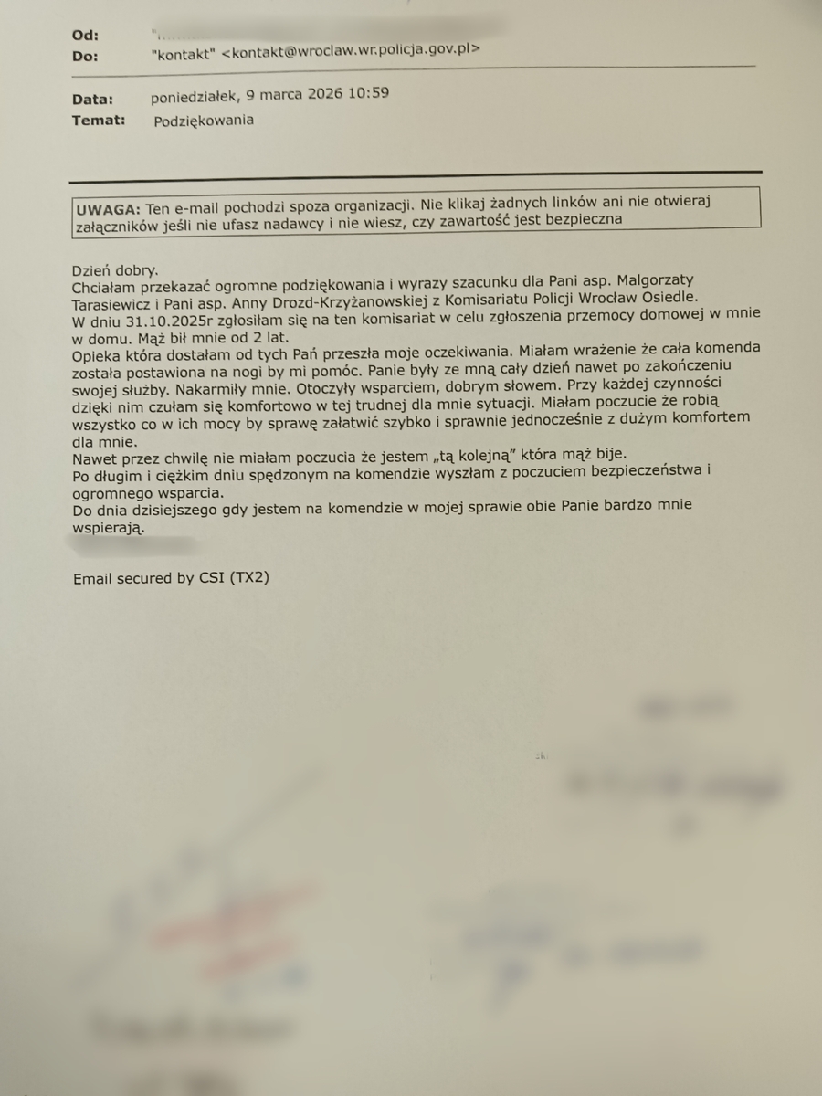 Autorka listu wyraziła wdzięczność za profesjonalizm, empatię oraz wsparcie, jakie otrzymała podczas zgłoszenia przemocy domowej. Jak podkreśliła, policjantki wykazały się ogromnym zaangażowaniem, poświęcając jej czas i zapewniając poczucie bezpieczeństwa w trudnej sytuacji życiowej.