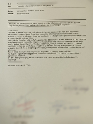Autorka podziękowań wskazała również, że dzięki postawie funkcjonariuszek wyszła z komisariatu z poczuciem bezpieczeństwa i przekonaniem, że jej sprawa jest traktowana z należytą powagą i zaangażowaniem. Do dziś – jak zaznacza – może liczyć na ich wsparcie.